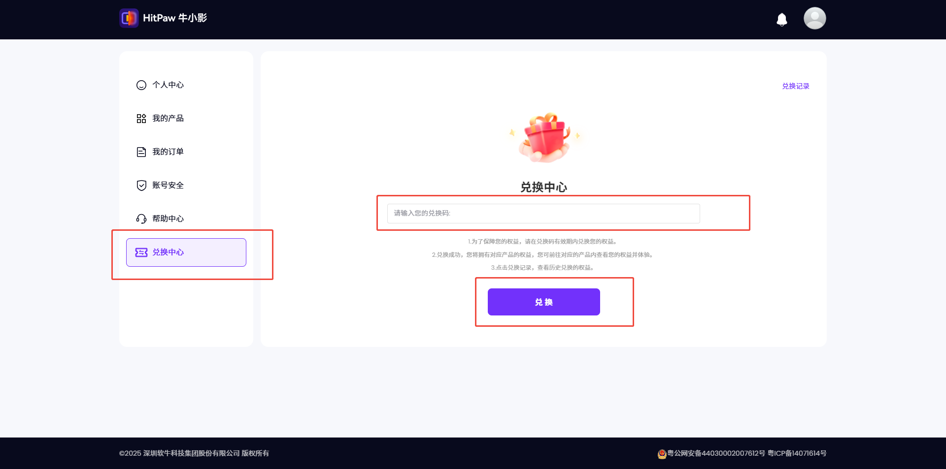 进入牛小影官网https://accounts.hitpaw.cn/dashboard 登录账号(一般是手机号码)-个人中心-兑换中心-输入您的兑换码即可兑换