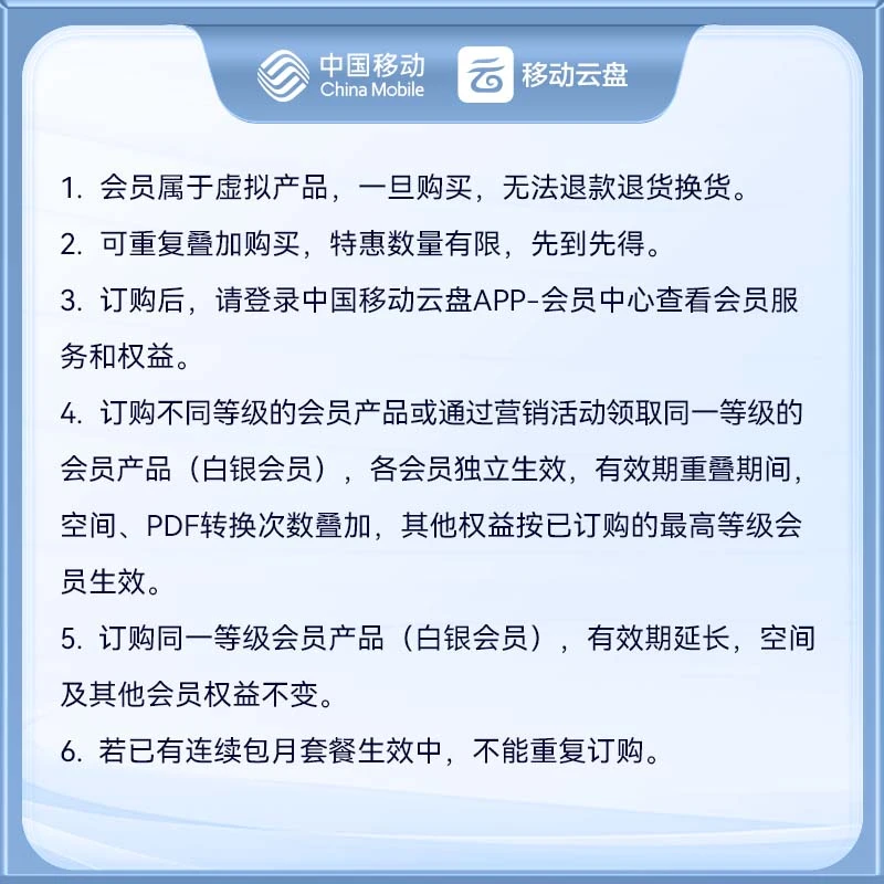 首页 > 商品目录 > 【账号直充】中国移动云盘白银会员『12个月』