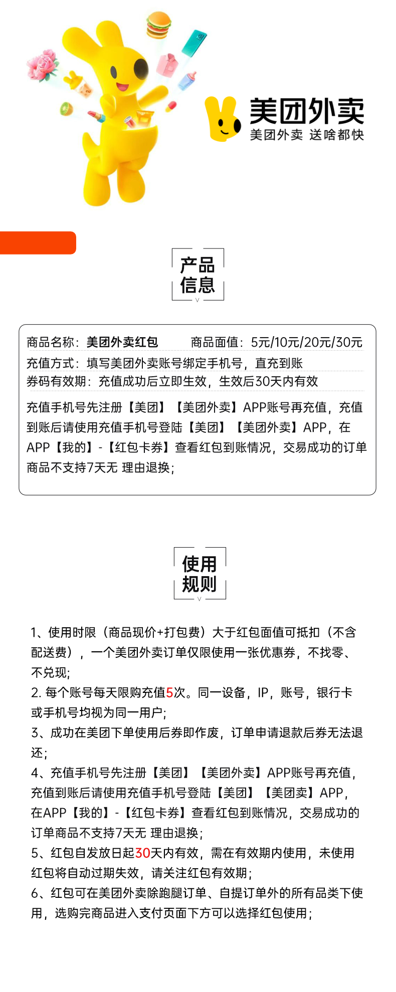 【账号直充】美团外卖通用红包『30元』-安诚权益