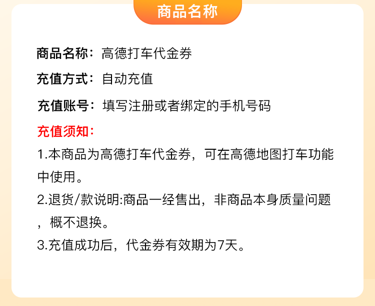 首页 > 商品目录 > 【账号直充】高德出行打车券『10元』